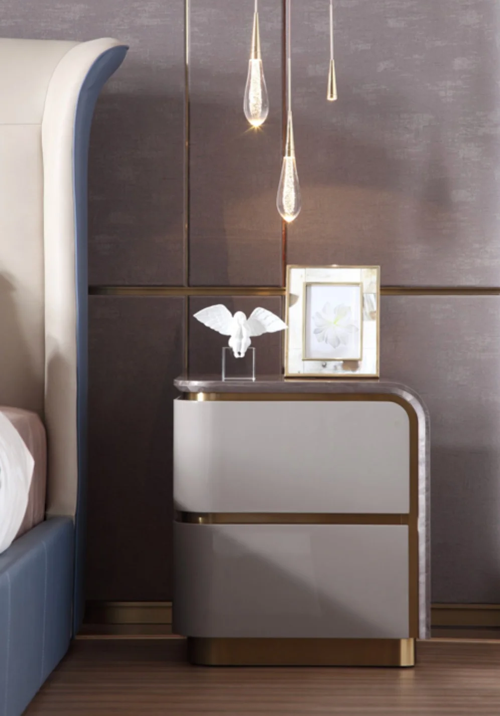 The Verona Nightstand blends sculptural curves with a sleek, modern silhouette. Its glossy finish is complemented by warm gold accents and a stone-inspired top, creating an elegant balance of luxury and minimalism. With smooth, rounded edges and discreet storage, it adds a refined, contemporary touch to any bedroom.